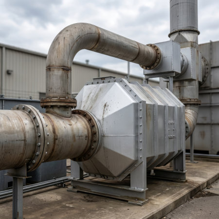 A robust industrial air filtration unit with large, weathered metal pipes and ductwork, secured by heavy bolts and flanges, sits on a concrete base under a cloudy sky.