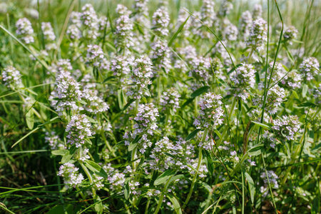 Close-up of wild thyme plants (Thymus serpyllum) covered in small purple flowers, thriving in a sunny green meadow during summer.