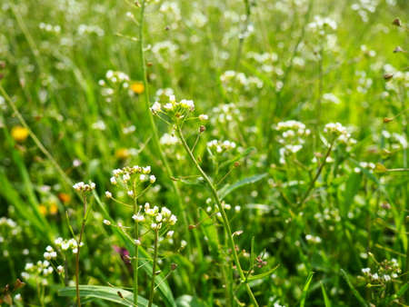 Close up of Capsella bursa-pastoris blooming in spring field. Summer Spring nature background.