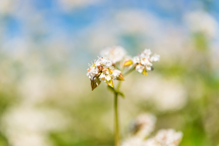 Buckwheat (Fagopyrum esculentum) flower in cultivated field, selective focus