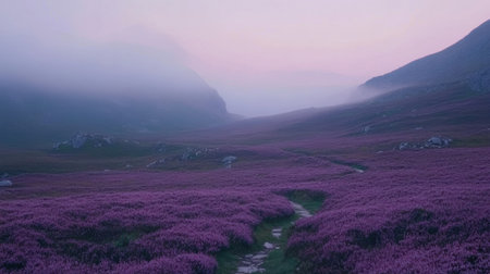 A serene lavender landscape showcases a soft purple hue during dusk, with misty mountains in the background and a winding pathway inviting exploration.
