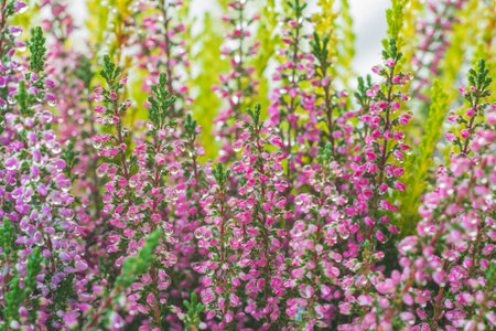 Morning dew on colorful calluna flowers