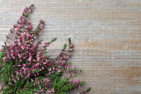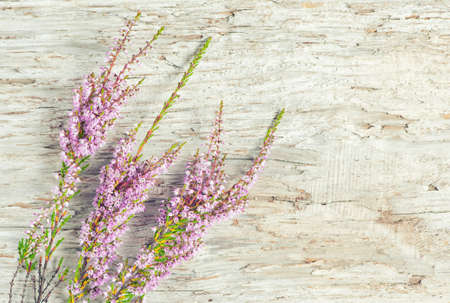 Branches of heather on the old wooden background