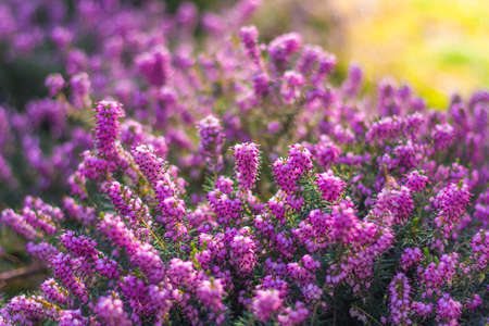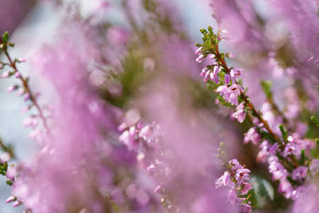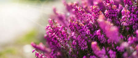 Close up pink heather flowers on a blurry background. Selective focus blooming heather flowers bush in sunset light. Natural spring background. Copy space.