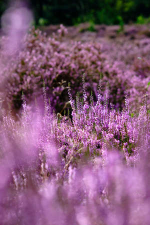 Purple Pink Heather with selective field of focus. Heathland and forest area called Den Treek Henschoten,part of the Utrechtse Heuvelrug,Utrecht Hill Ridge.National park in the Netherlands, Amersfoort