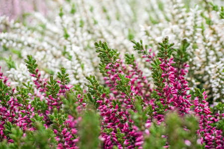 Purple and white flowering heather plants outdoors. Calluna vulgaris blooms and twigs. Autumnal wild growing or decorative garden plant in full bloom.