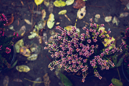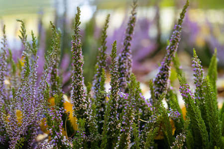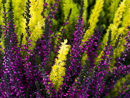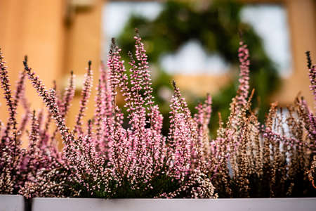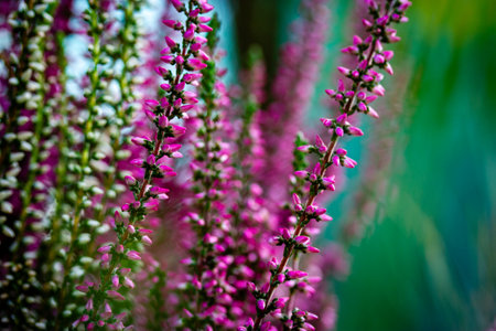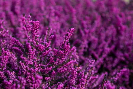 Common heather, Calluna vulgaris, in full bloom, selective focus and shallow DOF, colors in autumn garden