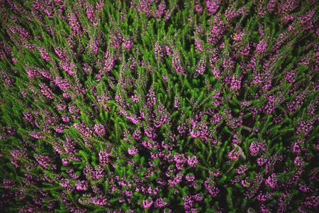Pink heather background close up. Blooming calluna texture.