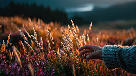 Woman's hand touching a dry grass in the meadow at sunset