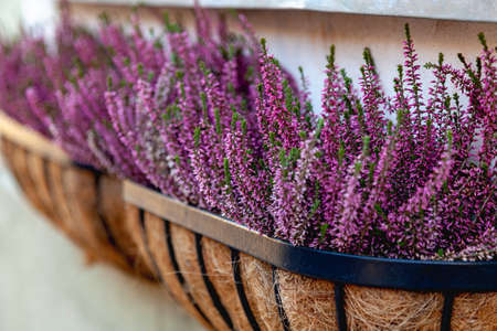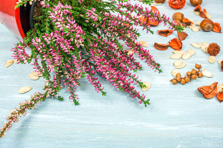 Beautiful heather flowers background. Close up of heather flowers. pink heather in autumn basket. home decor.