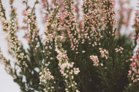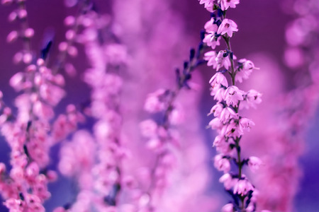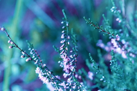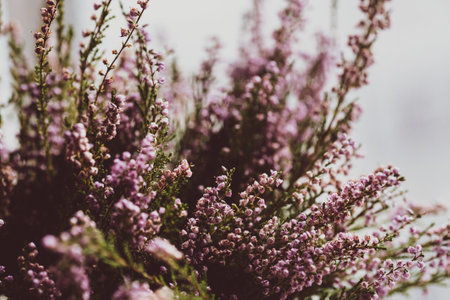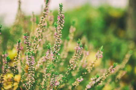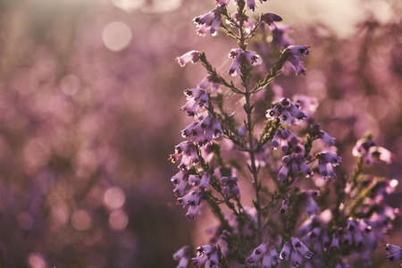 Blooming of beautiful heather flowers, natural seasonal vintage hipster floral background