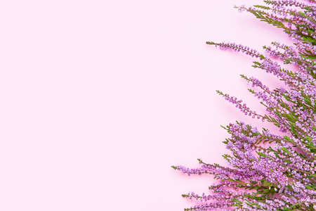 Pink Common Heather flowers border on a pink background. Copy space, top view. Flat lay, selective focus