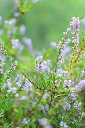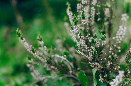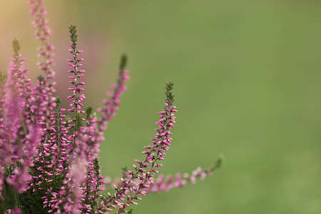 Blooming heather Calluna vulgaris on a green background. Nature background. Blurry abstract defocuse heather on a nature background copy text space.