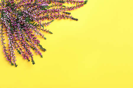 Heather branches with beautiful flowers on yellow background, flat lay. Space for text