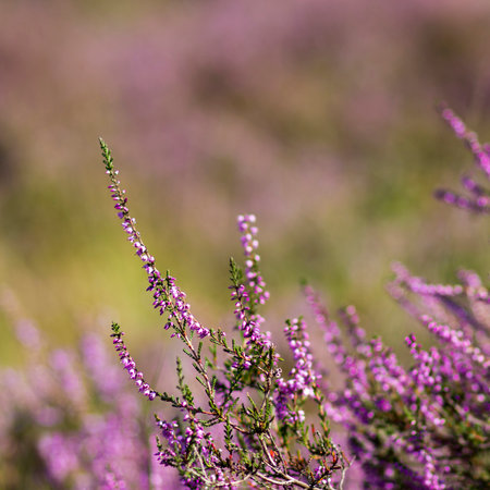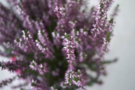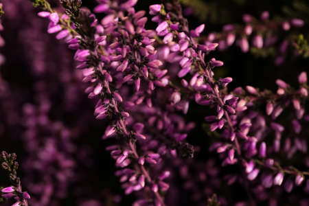 Close up of beautiful blooming purple heather flower. Selective focus.