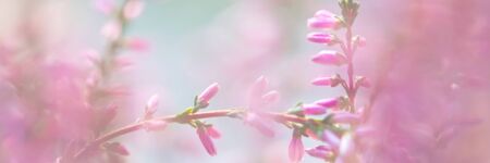 Delicate heather close-up. Soft floral background. Field of pink heather