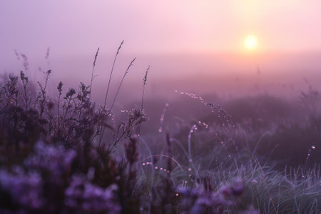 A field of purple flowers with a sun in the background. The sun is setting and the sky is a mix of purple and orange. The flowers are wet and the grass is damp. The scene is peaceful and serene