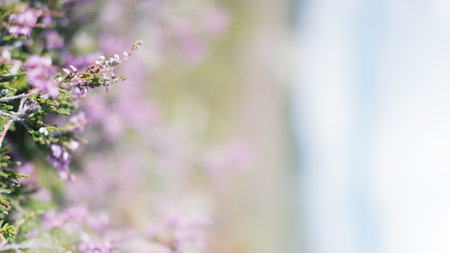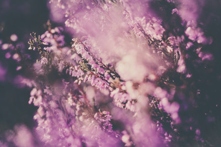 Beautiful purple heather cover in a Filled with of spring sunlight. Soft focused, creative toned natural seasonal background