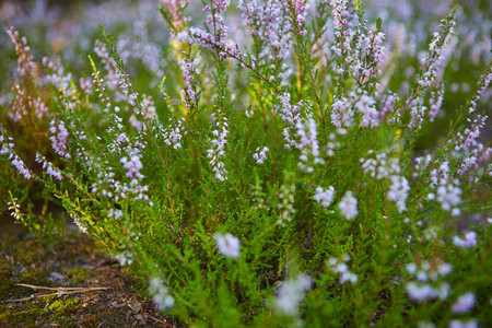 flowers field Calluna vulgaris. Small pink and white lilac petal plants, soft background. shallow depth of field, Czech Republic
