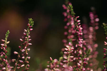 Purple pink common heather (Calluna vulgaris). Landscape plant heather. Colorful traditional October european flower. selective focus