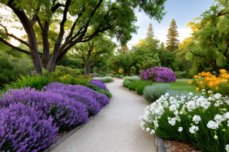 Exquisite colorful garden path through lush greenery, flourishing flowers, and vibrant vegetation