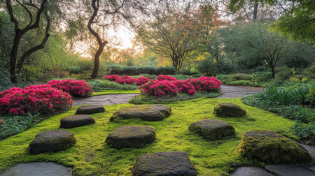 A serene garden scene showcasing a beautiful pathway adorned with stones and vibrant azaleas, surrounded by lush greenery and illuminated by soft morning light.