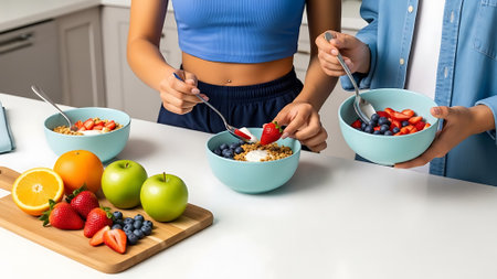 A woman and a man preparing breakfast bowls with fruits and cereals.