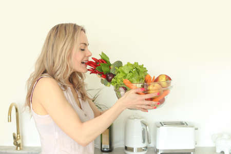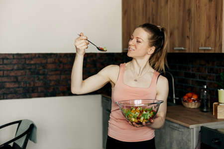 Young woman eating healthy salad in the kitchen. Healthy food concept.