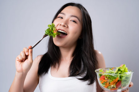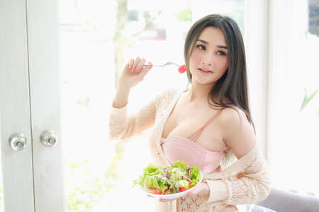 Portrait sexy asian woman wear lingerie or underwear with salad holding in hand, healthy diet concept