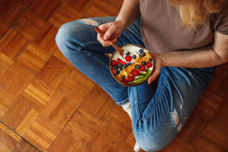 Healthy breakfast at home. Woman sitting on floor and eating yoghurt with fruit and corn flakes. Vegetarian food