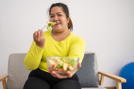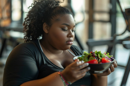 A plus-size model enjoying a healthy salad after a vigorous workout at the gym