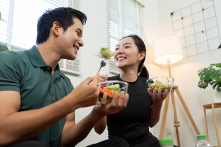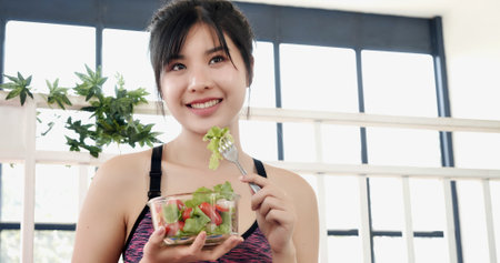 Healthy woman workout holding organic salad bowl healthy lifestyle. Wellness Asian women dressing organic green salad tomato vegetable dish. Beautiful girl healthcare vegan wellness lifestyle concept