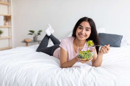 Beautiful young Indian woman eating vegetable salad while lying on bed at home, free space. Balanced raw food diet