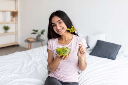 Positive Indian woman sitting on bed and eating delicious vegetable salad at home. Healthy diet for weight loss concept