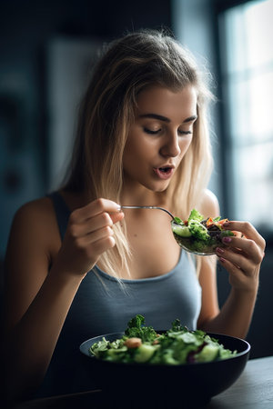 Woman takes a slow, mindful bite of fresh salad, showing commitment to a healthy lifestyle with visible results in a sunny room.