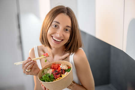Portrait of a happy woman eating healthy asian bowl with tuna and salad on the modern kitchen at home. Healthy takeaway asian food and modern lifestyle at home
