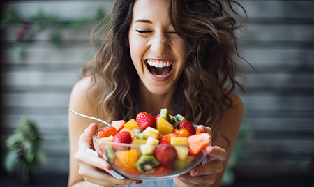 A woman wearing an orange top smiles as she savors a spoonful of fresh fruit in a modern kitchen. The bowl is filled with vibrant strawberries, blueberries, kiwi, and mango.