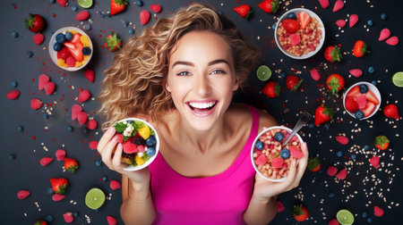 Beautiful smiling happy slim girl woman with healthy breakfast cereals and berries. Healthy spirit, healthy lifestyle, proper nutrition, mental health, sports and training, loss of excess weight, muscles.