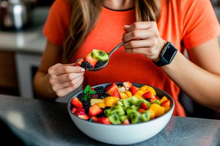 Close up of athletic woman eating a healthy fruit bowl in the kitchen at home
