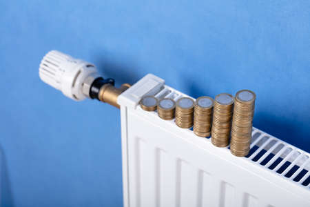 Stacked Of Coins Arrange In Row On Radiator In Front Of Blue Wall