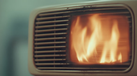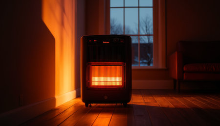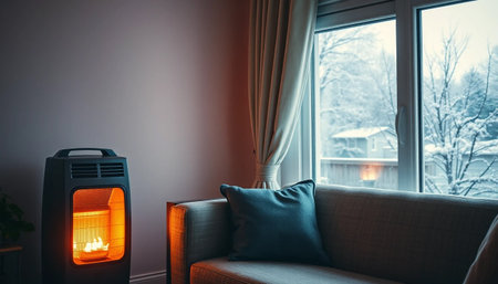Glowing heater providing warmth and comfort on a windowsill while raindrops fall against the window, creating a serene, cozy atmosphere inside during a cold night