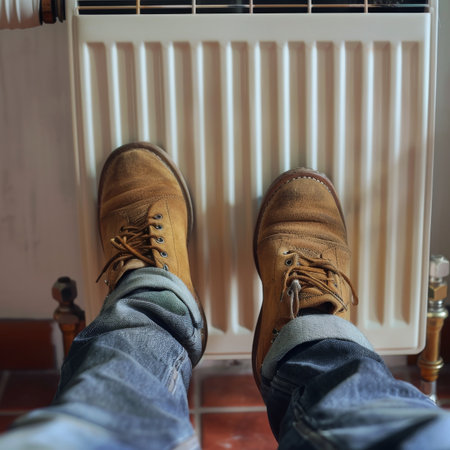 Warming Feet on White Radiator, Man Warms his Feet at Home, Cold Winter, Expensive Electricity Saving Concept, Copy Space, Generative AI Illustration