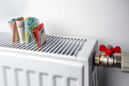 euro banknotes in a central heating radiator, the concept of expensive heating costs, close-up