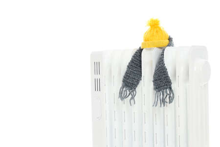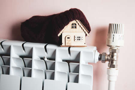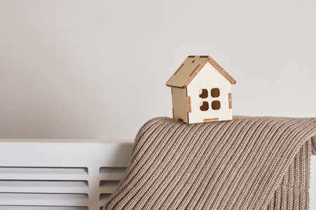 scarf and small wooden model of the house on an electric heating radiator, gray background, drinking season, cold house concept