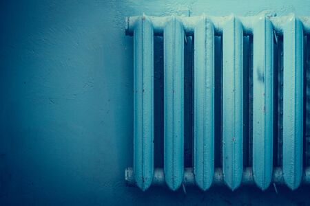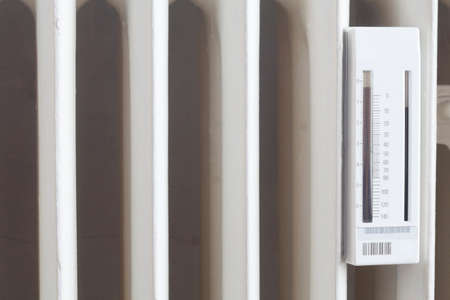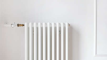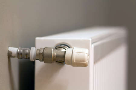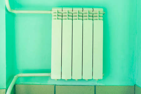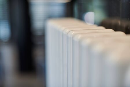 Heating radiator in office, close up. White heat exchangers. Iron aluminium steam radiator. Pipe pattern.