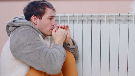 Man warming hands on radiator. Frozen male cringing from cold, warming hands on heating radiator in winter day.