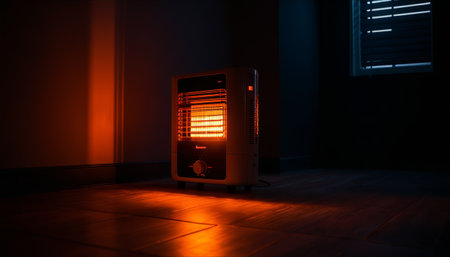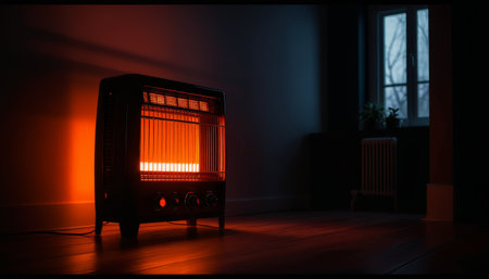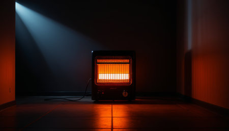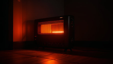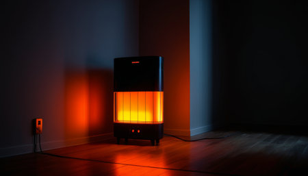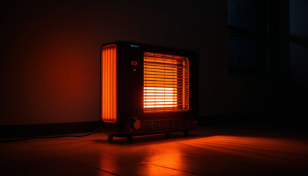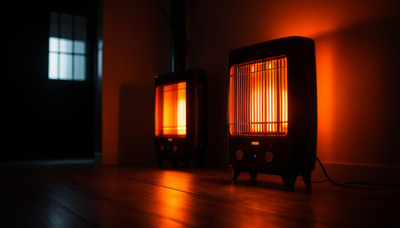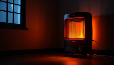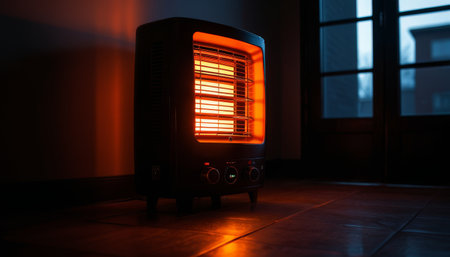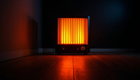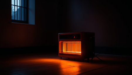 Electric heater glowing orange in a dark room, casting warm shadows on the walls
