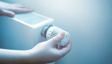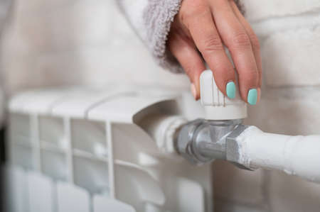 Woman hand regulates the temperature on the radiator, high electricity and gas prices, economic crisis