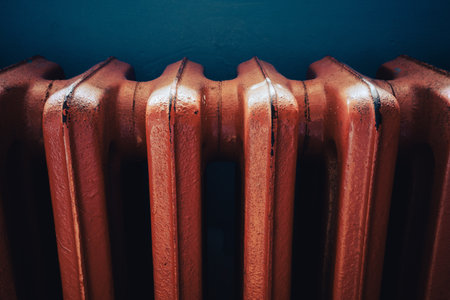 Improving the efficiency of the heating system and energy conservation concept. Money lying on top of an old cast-iron heating battery. Ukrainian five hundred hryvnia bills. Selective focus.