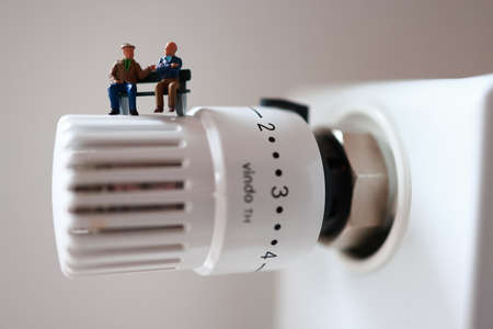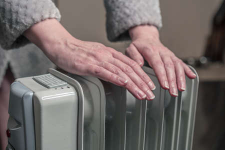 Hands of an elderly woman in woolen clothes feeling low temperature on an old heater, suffering from inflation and rising energy prices, copy space, selected focus, narrow depth of field